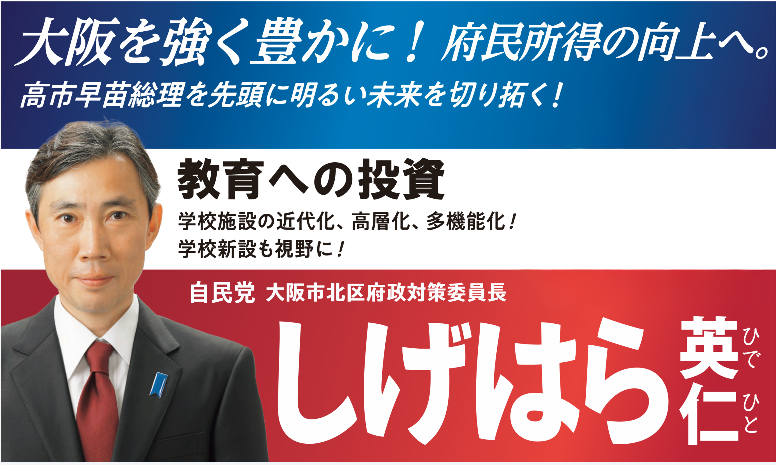 私、しげはら英仁は、大阪の中心である、この北区から、安心して暮らし、豊かさを実感できる大阪をつくるため、全力で活動してまいります。